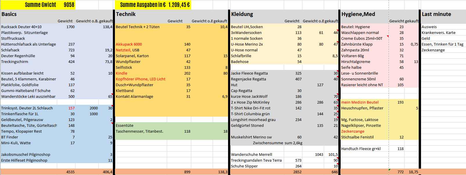 Infos zum Rucksack, Gewicht, Packliste